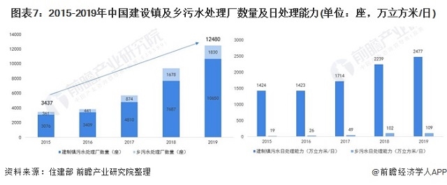 圖表7:2015-2019年中國建設(shè)鎮(zhèn)及鄉(xiāng)污水處理廠數(shù)量及日處理能力(單位:座,萬立方米/日)