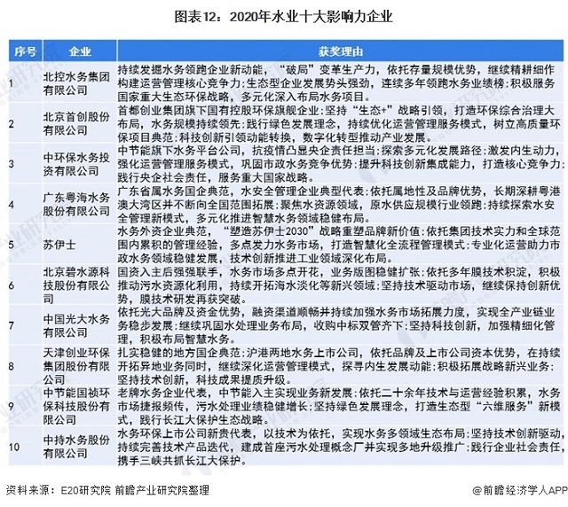 注:E20研究院根據(jù)企業(yè)的業(yè)績以及他們在資本市場、穩(wěn)健運營、企業(yè)社責(zé)任等方面的綜合評價出2020水業(yè)十大影響力企業(yè)。
