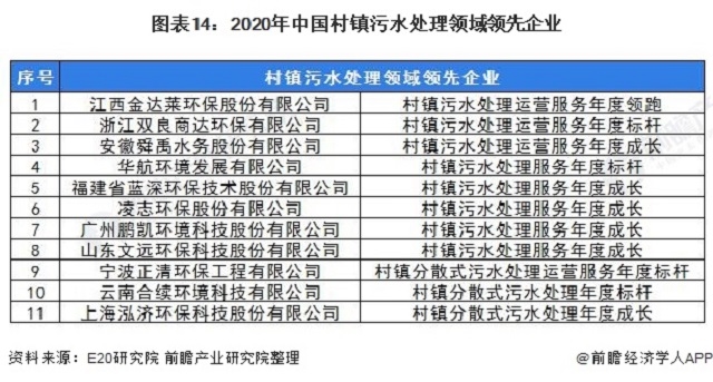 圖表14:2020年中國村鎮(zhèn)污水處理領(lǐng)域領(lǐng)先企業(yè)