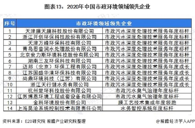 圖表13:2020年中國市政環(huán)境領(lǐng)域領(lǐng)先企業(yè)
