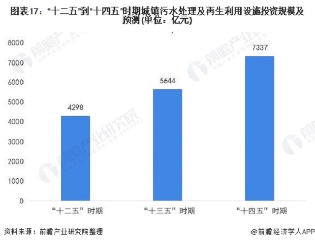 根據(jù)“十三五”規(guī)劃中針對水環(huán)境治理領(lǐng)域的投資規(guī)模,同時結(jié)合新時期的農(nóng)村水環(huán)境治理與幾大流域生態(tài)治理的工程總量與復(fù)雜程度綜合分析,前瞻判斷“十四五”規(guī)劃中針對水環(huán)境治理的投資規(guī)?;蜻M一步升級加碼至7337億元。中國污水處理市場仍有較大發(fā)展空間。