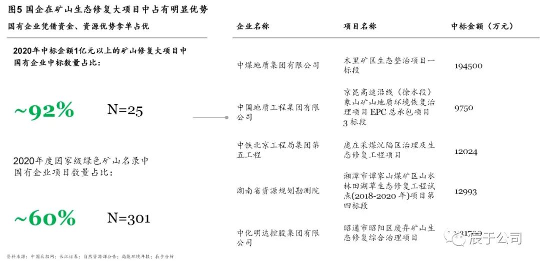 這四類企業(yè)中,具有國資背景的企業(yè)在大項目中標(biāo)占有明顯優(yōu)勢,據(jù)不完全統(tǒng)計,2020年中標(biāo)金額1億元以上的礦山生態(tài)修復(fù)大項目中,90%以上為國有企業(yè);301個國家級綠色礦山名錄中,60%以上是國有企業(yè)(見圖5)。