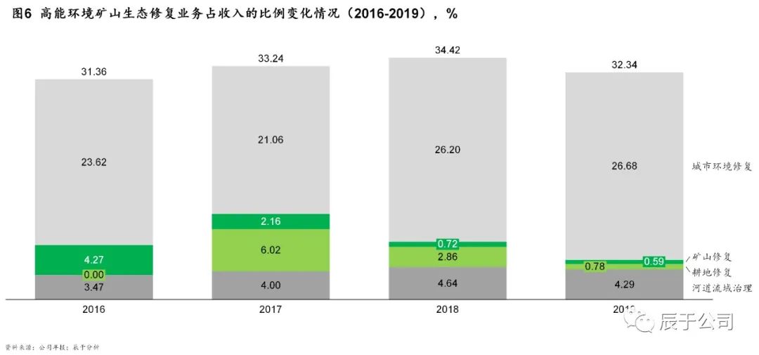 由于市場潛力并未有效釋放,領(lǐng)先的土壤修復(fù)企業(yè)參與這一市場較為謹(jǐn)慎,包括高能環(huán)境、中科鼎實、建工修復(fù)等龍頭在礦山生態(tài)修復(fù)領(lǐng)域的參與項目很少。以高能環(huán)境為例,近年來礦山生態(tài)修復(fù)占總收入的比重不升反降,2016年這一數(shù)字為4.27%,2019年則僅為0.59%(見圖6)。