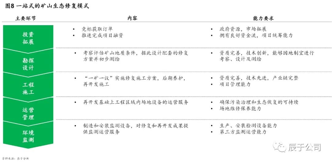 參考國際成熟經(jīng)驗,我們認(rèn)為未來EPC仍然是主流模式。不過隨著推進(jìn)大礦山生態(tài)修復(fù)勢在必行,預(yù)計PPP項目數(shù)量將有所增加,尤其是遼寧、河南、山東、內(nèi)蒙古等礦山生態(tài)修復(fù)走在前列的省份值得關(guān)注。當(dāng)然,這對入局企業(yè)也提出了更高要求,他們不僅要有較強的政府資源和市場拓展能力,還要關(guān)注礦山生態(tài)修復(fù)多環(huán)節(jié)的打通,提升諸如生態(tài)環(huán)境考察評估、破壞診斷、方案設(shè)計、修復(fù)系統(tǒng)構(gòu)造、生態(tài)景觀建設(shè)、系統(tǒng)跟蹤與維護(hù)、環(huán)境監(jiān)測等各項能力,打造一站式整體修復(fù)模式(見圖7)。