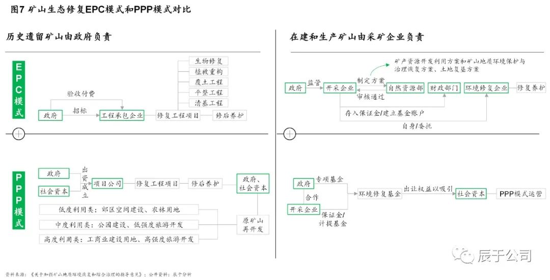 礦山生態(tài)修復(fù)主要有EPC和PPP兩種模式(見圖7),由于當(dāng)前的礦山生態(tài)修復(fù)主要依賴于各級地方政府規(guī)劃和中央及地方財政撥款,市場化程度不足,EPC是絕對主流模式,2020年的占比超過90%。這些EPC項目普遍工期短(多數(shù)項目工期在30到200天),以工程為主要內(nèi)容(多為清基、平整、覆土、植被重構(gòu)等)、復(fù)雜度低,主要以工程為盈利點,基本無后期運營。