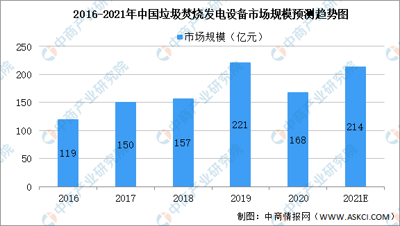 焚燒爐作為垃圾焚燒處理系統(tǒng)最核心的設(shè)備,其設(shè)計(jì)需充分考慮垃圾停留時(shí)間、燃燒溫度、煙氣在爐內(nèi)的停留時(shí)間及紊流等因素,從而達(dá)到完全燃燒、控制惡臭及二惡英類(lèi)物質(zhì)產(chǎn)生的目的。目前國(guó)內(nèi)外應(yīng)用較多、技術(shù)比較成熟的生活垃圾焚燒爐主要包括流化床焚燒爐、爐排爐型焚燒爐等。2020年,垃圾焚燒發(fā)電設(shè)備市場(chǎng)規(guī)模約為168億元。預(yù)計(jì)2021年我國(guó)垃圾焚燒發(fā)電設(shè)備市場(chǎng)規(guī)??蛇_(dá)214億元。