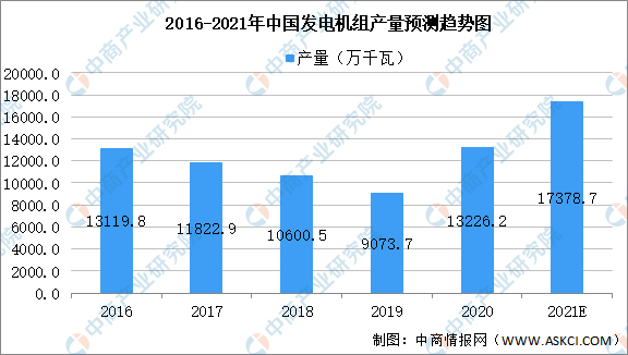 一般我們常見(jiàn)的發(fā)電機(jī)組通常由汽輪機(jī)、水輪機(jī)或內(nèi)燃機(jī)(汽油機(jī)、柴油機(jī)等發(fā)動(dòng)機(jī))驅(qū)動(dòng),可再生新能源包括核能、風(fēng)能、太陽(yáng)能、生物質(zhì)能、海洋能等。數(shù)據(jù)顯示,我國(guó)發(fā)電機(jī)組產(chǎn)量呈波動(dòng)趨勢(shì),2020年我國(guó)發(fā)電機(jī)組產(chǎn)量達(dá)13226.2萬(wàn)千瓦,預(yù)計(jì)2021年我國(guó)發(fā)電機(jī)組產(chǎn)量可達(dá)17378.7萬(wàn)千瓦。