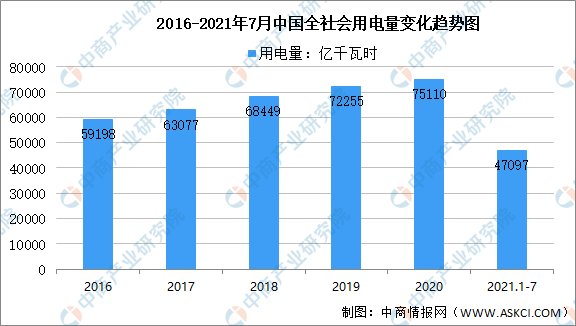 數(shù)據(jù)顯示,去年疫情影響基數(shù)低,2020年全社會(huì)用電量7.51萬(wàn)億千瓦時(shí),同比增長(zhǎng)3.1%。2021年1-7月,全社會(huì)用電量累計(jì)47097億千瓦時(shí),同比增長(zhǎng)15.6%。