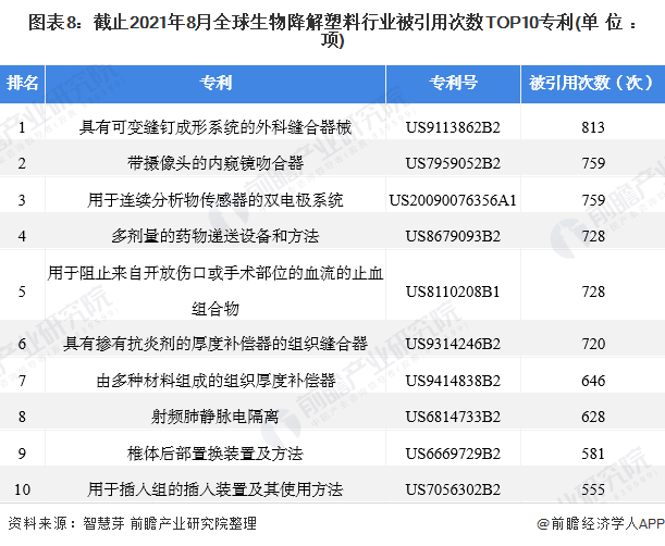 具有可變縫釘成形系統(tǒng)的外科縫合器械(專利號:US9113862B2)、帶攝像頭的內(nèi)窺鏡吻合器(專利號:US7959052B2)和用于連續(xù)分析物傳感器的雙電極系統(tǒng)(專利號:US20090076356A1)是被引用次數(shù)最多的三大生物降解塑料專利,三者被引用次數(shù)均超過750次。其它被引用次數(shù)前十大專利如下所示: