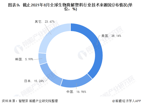 目前,全球生物降解塑料第一大技術(shù)來源國為美國,美國生物降解塑料專利申請量占全球生物降解塑料專利總申請量的38.14%;其次是中國,中國生物降解塑料專利申請量占全球生物降解塑料專利總申請量的16.96%。日本生物降解塑料專利申請量位居第三,占全球生物降解塑料專利總申請量的15.24%。