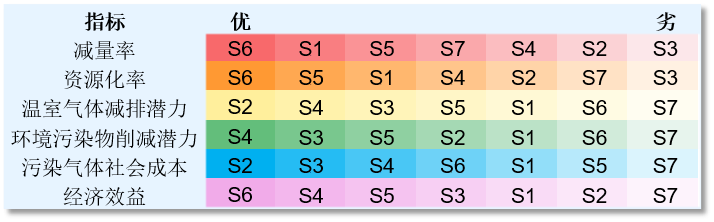為了能夠對廚余垃圾處理技術進行評估,基于現(xiàn)場調查和文獻調查,我們選擇了七種具有代表性的國內技術情景S1-S7作為研究對象。同時應用全生命周期分析方法,通過邊界范圍的確定,建立了綜合評價體系,對七種廚余垃圾處理技術的組合進行分析,并按不同的指標進行排名。最終我們建立結構評估模型,制定相應的決策矩陣,作為在不同情況下選取最合適、最有效以及對環(huán)境危害最小的廚余垃圾生物處理技術的工具。