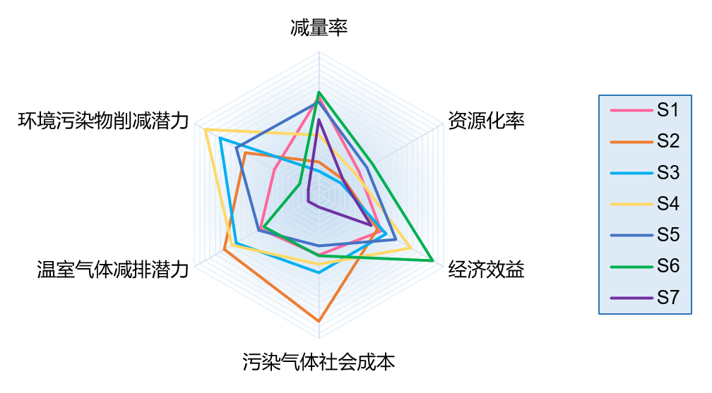 通過綜合考慮多項指標,可以得到各項技術的指標表現(xiàn)雷達圖,同時也可以看出各指標下不同處理技術的表現(xiàn)排名。