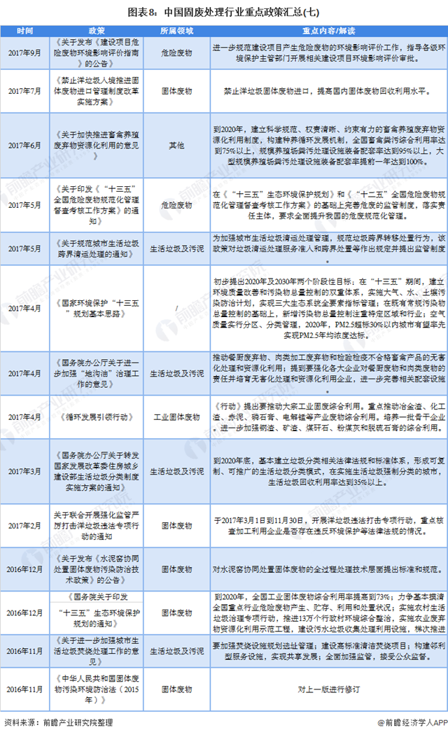 從“八五”規(guī)劃開始,我國(guó)就在國(guó)家層面戰(zhàn)略中不斷對(duì)固廢處理的概念和規(guī)劃進(jìn)行優(yōu)化。從“八五”的普遍固體廢物綜合利用的概念,到“九五”出現(xiàn)生活垃圾無(wú)害化處理, “十五”的危險(xiǎn)廢物集中處理,“十一五”的醫(yī)療廢物、廢棄電子產(chǎn)品和秸稈、農(nóng)膜、禽畜糞便等其他固體廢物,“十三五”的餐廚垃圾和建筑垃圾等一系列新的固廢概念的出現(xiàn)和分類標(biāo)準(zhǔn)的變更,給我國(guó)的固廢處理行業(yè)帶來(lái)了新的機(jī)遇與更高要求的政策標(biāo)準(zhǔn)。