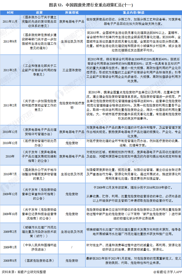 我國(guó)固廢行業(yè)相關(guān)的重點(diǎn)政策針對(duì)方面主要可分為綜合固體廢物、危險(xiǎn)廢物、工業(yè)固體廢物、廢棄電器電子產(chǎn)品、生活垃圾及污泥及其他,在該基礎(chǔ)上,針對(duì)不同方面出臺(tái)了數(shù)量相當(dāng)?shù)恼咭砸?guī)定和支持固廢處理及其相關(guān)產(chǎn)業(yè)(例如,垃圾焚燒發(fā)電等)的產(chǎn)業(yè)化發(fā)展。