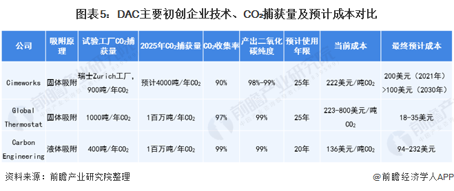 目前,全球有30余家初創(chuàng)公司、科研機(jī)構(gòu)、研發(fā)聯(lián)合體正在對DAC技術(shù)進(jìn)行研究,初創(chuàng)公司建立了19個試驗場為研究提供試驗數(shù)據(jù),修正研發(fā)方向。其中Climeworks公司、Global Thermostat公司、Carbon Engineering公司擁有自己的試驗場,已經(jīng)初步商業(yè)化。Carbon Engineering公司吸附劑類型為液體吸附,Climeworks和Global Thermostat為固體吸附劑。3家初創(chuàng)企業(yè)CO?捕獲量及預(yù)計成本如下: