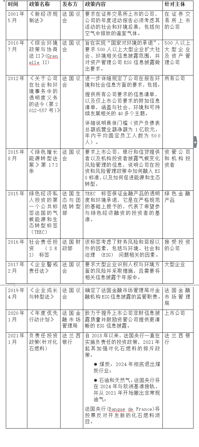 法國是全世界第一個將綠色金融納入法律范疇的國家。早在2001年,法國政府頒布新經(jīng)濟(jì)規(guī)制法案(NRE法案),啟動強(qiáng)制性財務(wù)外報告,要求上市公司披露其活動對環(huán)境和社會的影響。2010年的“Grenelle II 法案”第225條包含強(qiáng)制企業(yè)社會責(zé)任(CSR)信息披露的內(nèi)容,要求公司在年報中披露其環(huán)境及社會業(yè)績方面的信息。2012年,法國通過了關(guān)于公司在社會和環(huán)境事務(wù)中的透明度義務(wù)的法令(第2012-557號),進(jìn)一步詳細(xì)規(guī)定了公司在報告環(huán)境和社會信息方面的要求。對于法國金融界來說,《綠色增長能源轉(zhuǎn)型法案》173條是最具影響力的法案,明確要求上市公司、銀行和信貸提供者以及機(jī)構(gòu)投資者(資產(chǎn)所有者和投資經(jīng)理)提高氣候變化相關(guān)風(fēng)險的披露與透明度,該法案還包括與氣候相關(guān)金融信息披露工作組(TCFD)密切相關(guān)的措施,并要求法國當(dāng)局評估銀行業(yè)與氣候相關(guān)的風(fēng)險,法國成為世界上第一個對金融機(jī)構(gòu)提出ESG信息披露要求的主要經(jīng)濟(jì)體。2015年,法國生態(tài)與團(tuán)結(jié)轉(zhuǎn)型部發(fā)布了綠色經(jīng)濟(jì)私人投資的第一個公共標(biāo)簽——法國的氣候能源和生態(tài)轉(zhuǎn)型標(biāo)簽(TEEC),TEEC標(biāo)簽確保了金融產(chǎn)品的透明性和環(huán)保性,它授予條件嚴(yán)格,代表了參與綠色經(jīng)濟(jì)融資的投資者的要求。2016年,法國財政部提出了社會責(zé)任投資(SRI)標(biāo)簽,該標(biāo)簽考慮了財務(wù)風(fēng)險和回報以外的因素,包括與環(huán)境、社會和治理(ESG)問題相關(guān)的因素。2021年1月,法蘭西銀行針對自身投資發(fā)布了一項新的負(fù)責(zé)任投資政策,以加強(qiáng)其對化石燃料的排斥政策。據(jù)此,法蘭西銀行表示到2024年底,完全排除所有從事煤炭相關(guān)活動的公司,無論規(guī)模如何;2024年與歐洲基準(zhǔn)保持一致,2021年開始退出開始撤出非常規(guī)油氣;投票反對開發(fā)新的化石燃料項目。2021年3月,法蘭西銀行成立了氣候變化中心,以監(jiān)測其與氣候變化相關(guān)的所有舉措并確保其協(xié)調(diào)。
