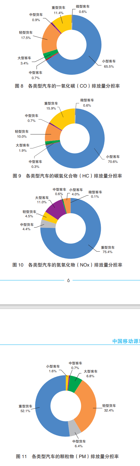 從車型上來看,4項污染物排放分擔率,一氧化碳(CO)、碳氫化合物(HC)占比最大的均為小型客車,分別達到65.5%、70.6%;氮氧化物(NOx)、顆粒物(PM)占比最大的則為重型貨車,達到75.4%和52.1%。