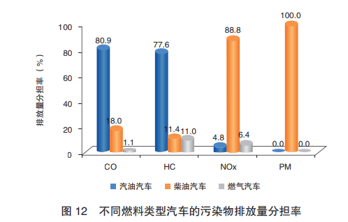 從燃料類型上看,4項污染物排放分擔率,一氧化碳(CO)、碳氫化合物(HC)占比最大的為汽油汽車;氮氧化物(NOx)、顆粒物(PM)則為柴油汽車。其中,柴油類汽車在PM排放分擔率上達到100%。