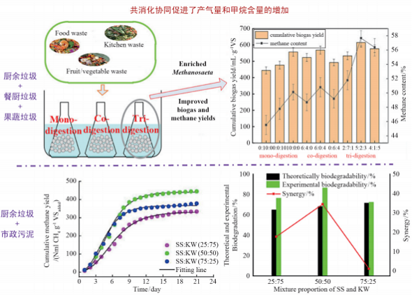 另一方面,將廚余垃圾與其他有機(jī)廢棄物混合共消化,其不同基質(zhì)間對(duì)產(chǎn)沼的協(xié)同效應(yīng)也不容忽視。