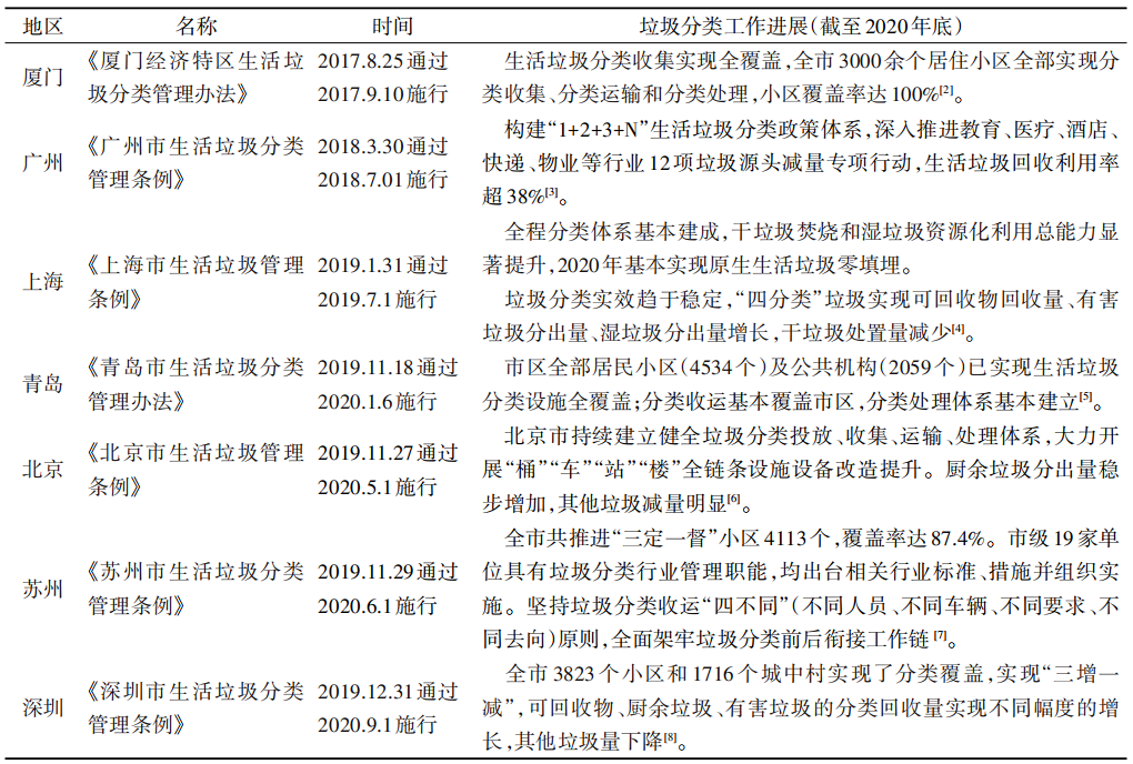 自2017年3月,國家發(fā)展改革委員會(huì)、住房城鄉(xiāng)建設(shè)部聯(lián)合發(fā)布了《生活垃圾分類制度實(shí)施方案》(以下簡(jiǎn)稱《方案》[1])起,中國生活垃圾分類進(jìn)入“強(qiáng)制時(shí)代”,從過去的自愿參與,到法律法規(guī)條款下的強(qiáng)制執(zhí)行,垃圾分類已經(jīng)走過3個(gè)年頭。2020年4月29日第二次修訂通過的《中華人民共和國固體廢物污染環(huán)境防治法》提出設(shè)立生活垃圾分類制度,并堅(jiān)持政府推動(dòng)、全民參與、城鄉(xiāng)統(tǒng)籌、因地制宜、簡(jiǎn)便易行的原則?!斗桨浮分刑岢?020年底中國的省轄市、省會(huì)城市以及一些計(jì)劃單列市等46 座城市均要先行實(shí)施生活垃圾強(qiáng)制分類,從中央到地方,上海2019年帶頭實(shí)施,北京、廣州、浙江等省份2020年緊隨其后,過去1年垃圾分類行動(dòng)如火如荼向前推進(jìn)。表 1 整理了中國部分典型城市發(fā)布的垃圾分類相關(guān)政策方案,并對(duì)發(fā)布實(shí)施時(shí)間及工作進(jìn)展進(jìn)行梳理,其中廈門、廣州及上海分別代表了2017— 2019 年開展相關(guān)行動(dòng)的地區(qū),青島、北京、蘇州及深圳為2020年開始施行垃圾分類的重點(diǎn)城市,西安、成都、沈陽、濟(jì)南和石家莊將于 2021年正式實(shí)施。 住房和城鄉(xiāng)建設(shè)部于2020年12月召開新聞通氣會(huì)表示,中國當(dāng)前生活垃圾分類工作取得了階段性進(jìn)展,46個(gè)重點(diǎn)城市生活垃圾分類覆蓋7700 多萬家庭,居民小區(qū)覆蓋率 86.6%,其他地級(jí)城市生活垃圾分類已全面啟動(dòng)。