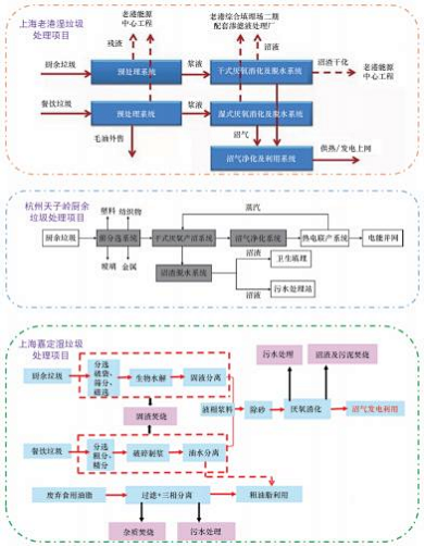 圖3為上海老 港濕垃圾處理項(xiàng)目[33]、杭州天子嶺廚余垃圾處理項(xiàng) 目[34]、上海嘉定是垃圾處理項(xiàng)目工藝路線[35]。