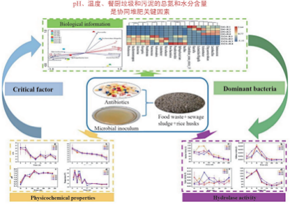 Chen等[39]將餐廚垃圾與污水污泥進(jìn)行協(xié)同好氧堆肥,研究了抗生素對(duì)水解酶活性和微生物群落的影響,發(fā)現(xiàn)5 mg/kg 的抗生素會(huì)降低纖維素酶的活性,增加脂肪酶和蛋白酶的活性,pH和溫度是影響微生物群落演替的最重要因素,其次是餐廚垃圾和污泥的共同堆肥過程中的總氮和水分含量(圖 4[39])。