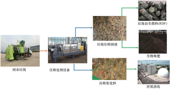 通過物理機(jī)械手段對(duì)廚余垃圾進(jìn)行預(yù)處理,有助于廚余垃圾更高效地實(shí)現(xiàn)減量化和資源化。目前國內(nèi)外研究和推廣較多的物理預(yù)處理技術(shù)主要包括粉碎直排和機(jī)械壓榨。廚余垃圾經(jīng)過物理手段預(yù)處理后的粒度變細(xì)可實(shí)現(xiàn)固體和漿體液的高效分離,可通過家庭下水排放進(jìn)入污水處理系統(tǒng),或通過制成垃圾衍生燃料、堆肥以及厭氧發(fā)酵等技術(shù)進(jìn)一步開發(fā)利用。