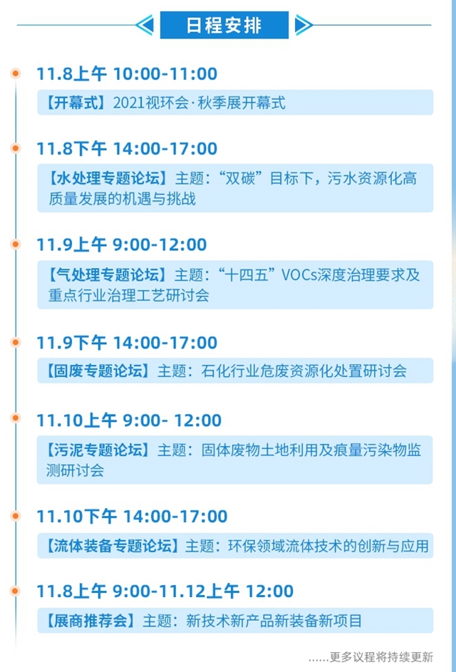 2021視環(huán)會·秋季展(第4屆)將于11月8—12日線上開展,同期開幕式、多場相關(guān)主題交流會議、活動、新品發(fā)布會等將輪番舉行。本屆視環(huán)會同期在線論壇將以“創(chuàng)新助力高質(zhì)量發(fā)展 共謀環(huán)保產(chǎn)業(yè)‘雙碳’發(fā)展路徑”為主題,圍繞:市政污水處理、污泥處理處置、膜技術(shù)與高難度廢水處理、VOCs處理及大氣污染防治、環(huán)境監(jiān)測與服務(wù)、固體廢物資源化利用與處置、智慧節(jié)能等領(lǐng)域?qū)n}進(jìn)行探討。