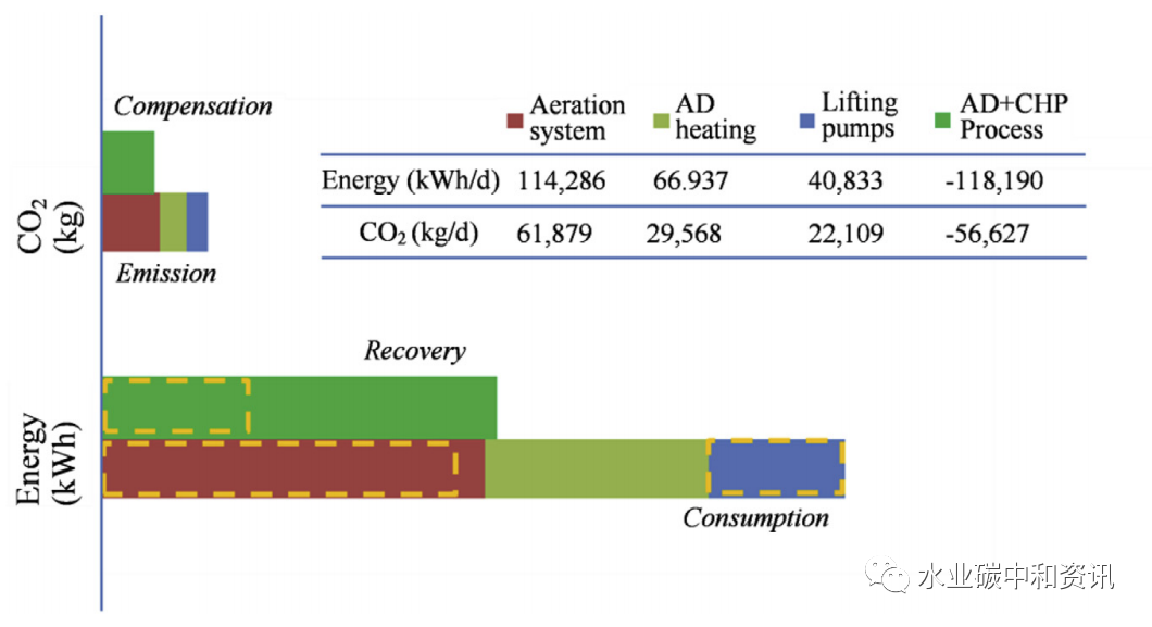 另一方面,污水中余溫?zé)崮芸梢酝ㄟ^(guò)水源熱泵轉(zhuǎn)化出熱量,以平衡能量赤字,甚至達(dá)到碳中和。一項(xiàng)關(guān)于污水處理廠(普遍COD = 200 ~ 400 mg/L)能量平衡評(píng)估表明,中國(guó)剩余污泥厭氧消化產(chǎn)甲烷只能彌補(bǔ)約50%的運(yùn)行能量消耗(Hao et al.)。進(jìn)一步研究表明,水源熱泵能夠有效轉(zhuǎn)化污水熱能,用以加熱污水處理廠及其周邊建筑,可提供約0.20 kWh·m-3·℃-1 凈電當(dāng)量。總的來(lái)說(shuō),中國(guó)有機(jī)物及熱能能夠有效供給充足的電當(dāng)量,足以達(dá)到碳中和運(yùn)行目標(biāo)。污水處理廠能耗及碳排放情況