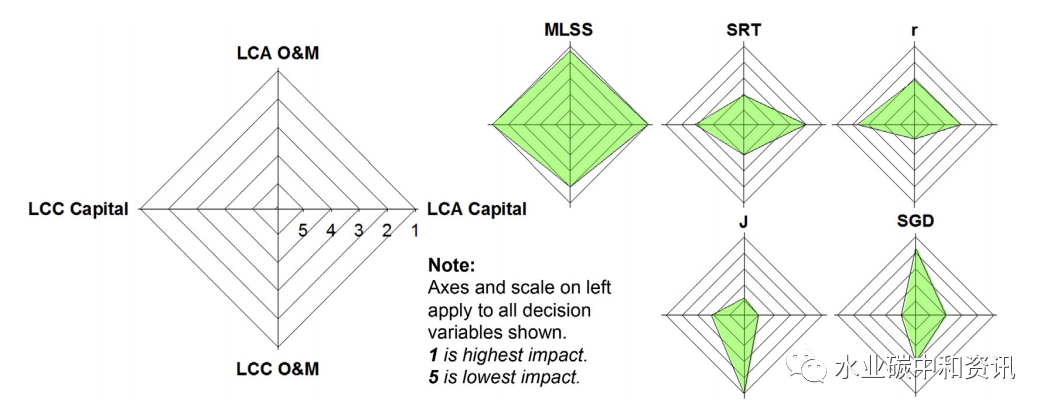 各類(lèi)方案中可持續(xù)指標(biāo)評(píng)價(jià)一項(xiàng)以可持續(xù)碳中和運(yùn)行為目標(biāo)的積極分析表明,淹沒(méi)式厭氧膜生物反應(yīng)器(AnMBR)可能是凈能量明顯的,有利于形成碳負(fù)污水管理(Pretel et al.)。在該分析中,利用定量可持續(xù)設(shè)計(jì)過(guò)程,使用技術(shù)、環(huán)境和經(jīng)濟(jì)標(biāo)準(zhǔn)評(píng)估了全部可行的設(shè)計(jì)方案,來(lái)完善AnMBR詳細(xì)設(shè)計(jì)。其中,集成了跨季節(jié)溫度穩(wěn)態(tài)性能建模(使用中試實(shí)驗(yàn)數(shù)據(jù)和模擬軟 DESASS)、生命周期成本分析(LCC)和生命周期評(píng)價(jià)(LCA)。