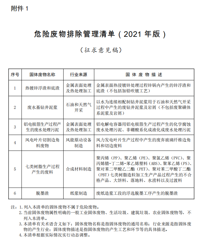 附件:1.危險(xiǎn)廢物排除管理清單(2021年版)(征求意見(jiàn)稿)