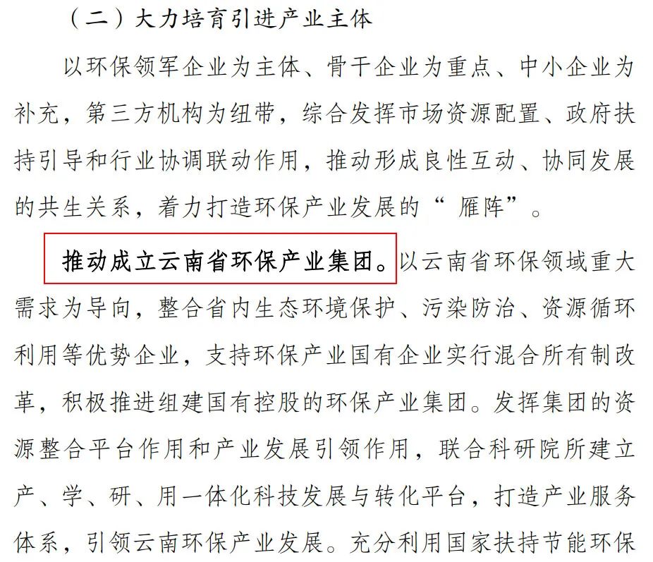 不過(guò),這個(gè)“福建省生態(tài)環(huán)保集團(tuán)”到底什么時(shí)候組建完成,其中都包括什么內(nèi)容,一切具體的信息就都不知道了。還有云南,今年7月,云南省發(fā)布《云南省“十四五”環(huán)保產(chǎn)業(yè)發(fā)展規(guī)劃(征求意見(jiàn)稿)》,其中提到,要推動(dòng)成立云南省環(huán)保產(chǎn)業(yè)集團(tuán)。以云南省環(huán)保領(lǐng)域重大需求為導(dǎo)向,整合省內(nèi)生態(tài)環(huán)境保護(hù)、污染防治、資源循環(huán)利用等優(yōu)勢(shì)企業(yè),支持環(huán)保產(chǎn)業(yè)國(guó)有企業(yè)實(shí)行混合所有制改革,積極推進(jìn)組建國(guó)有控股的環(huán)保產(chǎn)業(yè)集團(tuán)。