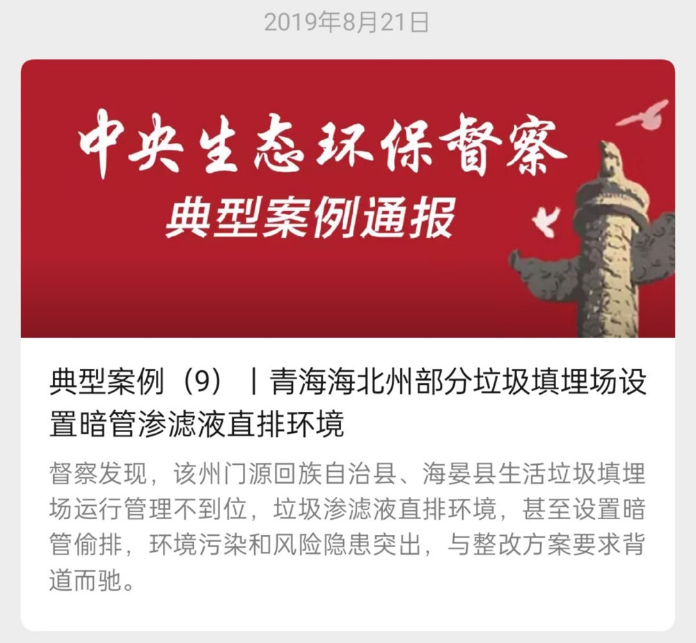 1、典型案例(9)丨青海海北州部分垃圾填埋場設(shè)置暗管滲濾液直排環(huán)境,生態(tài)環(huán)境部,2019-08-21