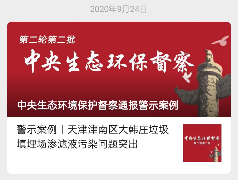 2、警示案例丨天津津南區(qū)大韓莊垃圾填埋場滲濾液污染問題突出,生態(tài)環(huán)境部,2020-09-24