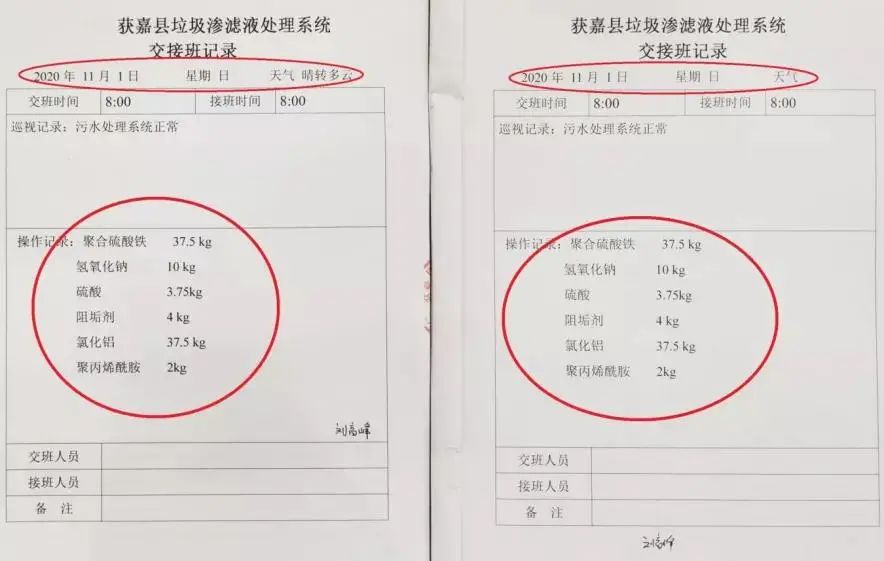 ▼獲嘉縣垃圾臨時填埋坑滲濾液處理系統(tǒng)交接班記錄同一天重復(fù)造假