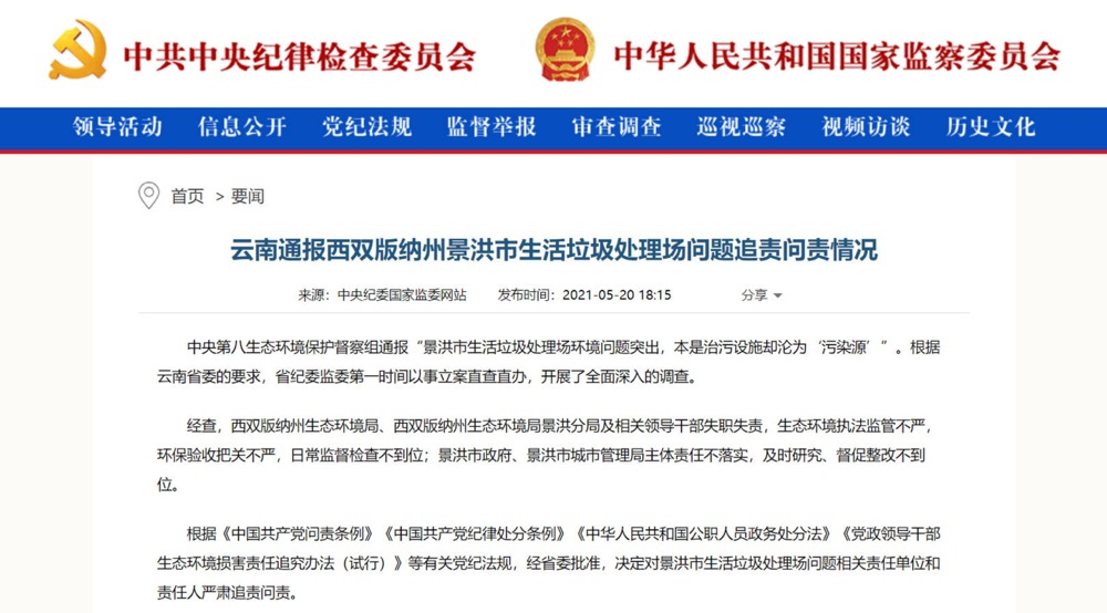 14、云南通報西雙版納州景洪市生活垃圾處理場問題追責(zé)問責(zé)情況,中央紀(jì)委國家監(jiān)委網(wǎng)站,2021-05-20