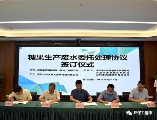 日前深圳市深水水頭污水處理有限公司、不凡帝范梅勒糖果(旗下產品有阿爾卑斯等)深圳有限公司舉行了《糖果生產廢水委托處理協(xié)議》簽約儀式。深圳市生態(tài)環(huán)境局大鵬管理局、大鵬新區(qū)水務局、大鵬排水有限公司作為見證方共同簽署了《糖果生產廢水委托處理協(xié)議》。