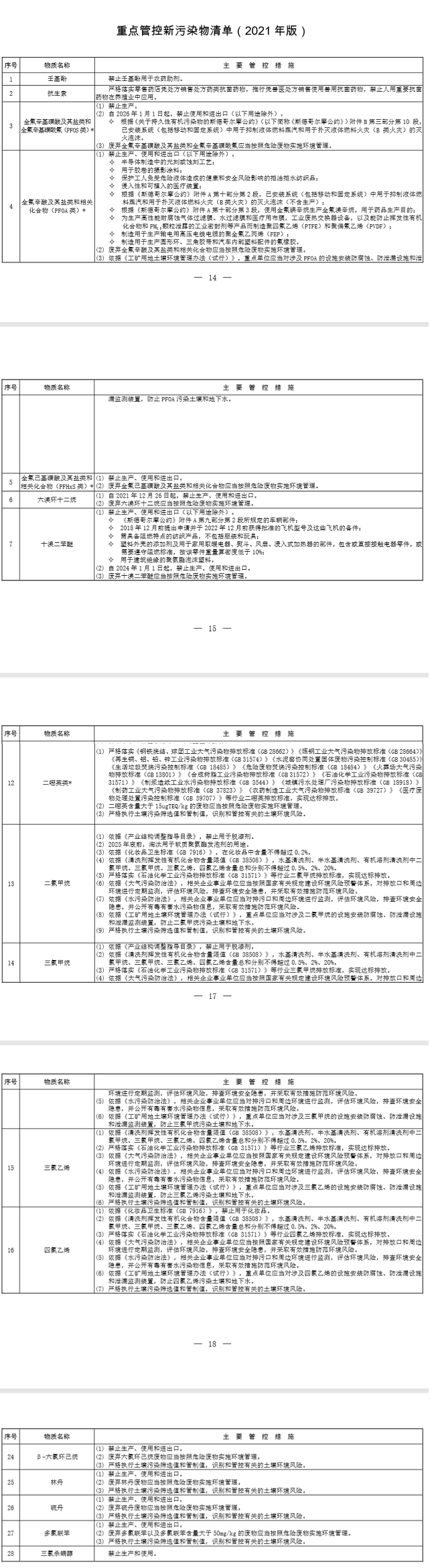 (九)嚴格實施淘汰或限用措施。將擬禁止或限制生產(chǎn)、加工使用的化學物質(zhì)以及相關工藝、裝備等納入《產(chǎn)業(yè)結(jié)構(gòu)調(diào)整指導目錄》淘汰類或限制類,研究將相關替代品及替代技術納入《產(chǎn)業(yè)結(jié)構(gòu)調(diào)整指導目錄》鼓勵類。對納入《產(chǎn)業(yè)結(jié)構(gòu)調(diào)整指導目錄》淘汰類或限制類的工業(yè)化學品、農(nóng)藥、藥品、獸藥、化妝品等,依法停止其產(chǎn)品登記或生產(chǎn)許可證核發(fā)。嚴格涉新污染物建設項目準入,強化環(huán)境影響評價管理,不符合禁止生產(chǎn)或限制使用化學物質(zhì)管理要求的建設項目,依法不予批準實施。將擬禁止進出口的化學品納入《禁止進(出)口貨物目錄》,加強進出口管控;將嚴格限制用途的化學品納入《中國嚴格限制的有毒化學品名錄》,強化進出口環(huán)境許可管理;采取激勵政策,引導企業(yè)事業(yè)單位持續(xù)開發(fā)推廣無毒無害、低毒低害原料和產(chǎn)品。自 2021 年 12 月 26 日起,禁止六溴環(huán)十二烷的生產(chǎn)、加工使用和進出口;到 2022 年底,禁止銷售含塑料微珠的日化產(chǎn)品。2025 年底前,逐步禁止 PFHxS 類、十溴二苯醚、短鏈氯化石蠟、五氯苯酚及其鹽類和酯類、六氯丁二烯、得克隆的生產(chǎn)、加工使用和進出口;嚴格限制 PFOS 類、PFOA 類的生產(chǎn)和加工使用;禁止壬基酚用于農(nóng)藥助劑;基本實現(xiàn)二噁英類全面達標排放。
