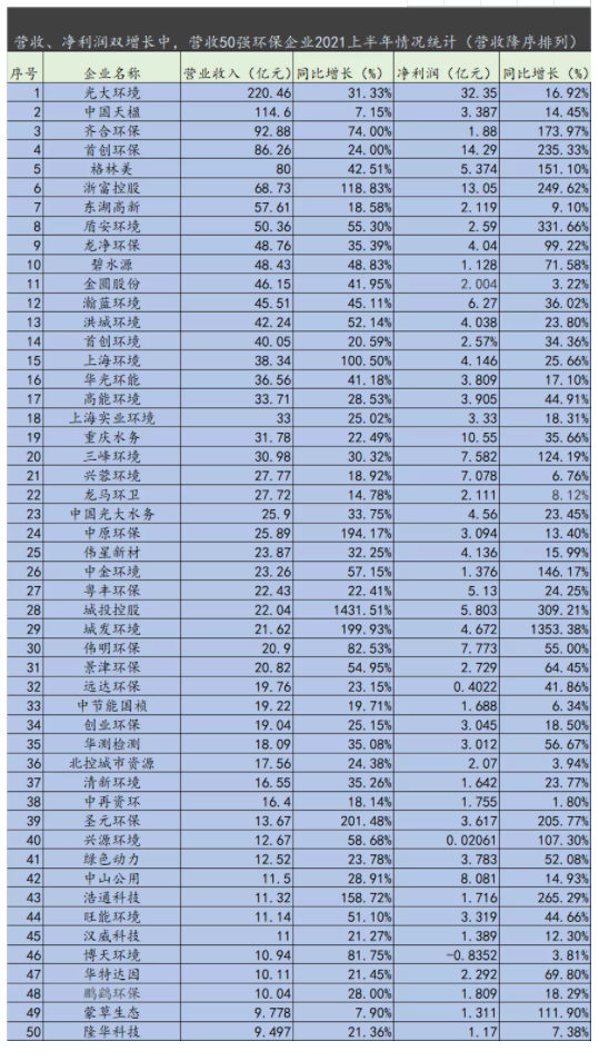 附:營收&凈利雙增環(huán)保企業(yè)中的營收五十強企業(yè)數(shù)據(jù)一覽表