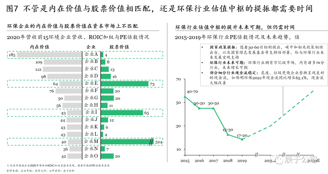 但必須承認(rèn)的是,向好趨勢(shì)的背后,我國(guó)資本市場(chǎng)的制度完善仍需時(shí)間。首先是生態(tài)環(huán)保企業(yè)內(nèi)在價(jià)值與股票價(jià)值的相匹配需要時(shí)間,在對(duì)生態(tài)環(huán)保企業(yè)2020年?duì)I收前15強(qiáng)的營(yíng)收、ROIC加權(quán)和PE倍數(shù)進(jìn)行分析得到,多數(shù)企業(yè)(如企業(yè)A、E、I、M)的內(nèi)在價(jià)值與股票價(jià)值在資本市場(chǎng)上并不匹配。其次是生態(tài)環(huán)保估值中樞的提升仍需時(shí)日,盡管隨著國(guó)家政策的提振、生態(tài)環(huán)保行業(yè)的發(fā)展、部分細(xì)分行業(yè)企業(yè)現(xiàn)金流狀況的改善,環(huán)保估值中樞提升未來(lái)可期,但也并不是一蹴而就的(見(jiàn)圖7)。