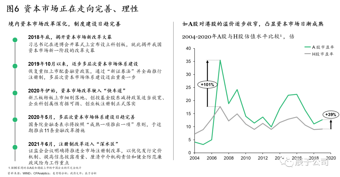 政策推動(dòng)下,國(guó)內(nèi)資本市場(chǎng)改革逐步深化,制度建設(shè)日趨完善,生態(tài)環(huán)保企業(yè)面臨的資本市場(chǎng)大環(huán)境正走向理性。A股對(duì)H股的溢價(jià)逐步收窄便是其中一佐證:基于對(duì)95家同時(shí)在A股和港股上市的企業(yè)的分析,可以看到相比于2006年最高峰時(shí)A股對(duì)H股超過(guò)100%的溢價(jià),當(dāng)前30%-40%的溢價(jià)已有明顯收窄(見(jiàn)圖6)。