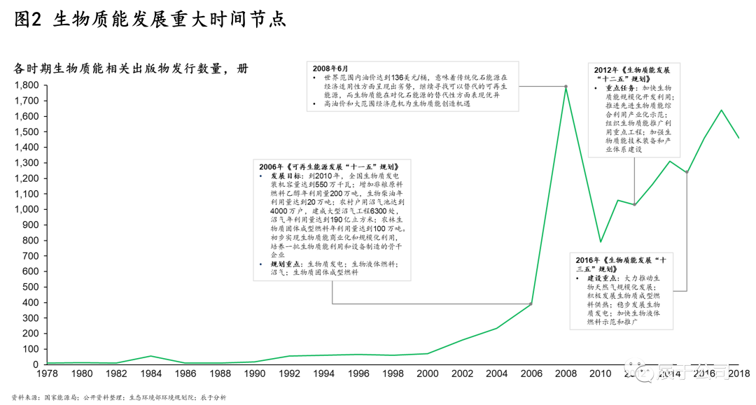 然而總的來(lái)說(shuō),生物質(zhì)能發(fā)展的時(shí)間并不長(zhǎng),21世紀(jì)以前這個(gè)領(lǐng)域的相關(guān)研究極少,我國(guó)也直到“十一五”才首次將其納入規(guī)劃范圍。2008年石油危機(jī)促使人類開(kāi)始尋找替代能源,生物質(zhì)能也逐漸成為一個(gè)重要的選項(xiàng)(見(jiàn)圖2)。