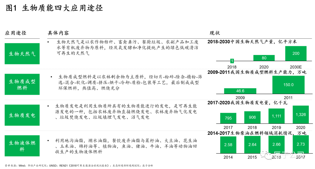 生物質(zhì)能是指太陽(yáng)能以化學(xué)能形式儲(chǔ)存在生物質(zhì)中的能量形式,燒柴火便是對(duì)生物質(zhì)能的利用,自從人類學(xué)會(huì)了使用火,生物質(zhì)能就成為重要的能源來(lái)源之一?,F(xiàn)代生物質(zhì)能行業(yè)進(jìn)一步對(duì)各種有機(jī)質(zhì)中的能源進(jìn)行加工和轉(zhuǎn)換,變成各類更易儲(chǔ)存、運(yùn)輸和使用的能源類型,具體可分為四大類別:生物天然氣,生物質(zhì)發(fā)電,生物質(zhì)成型燃料,生物液體燃料。這四類均已有一定的發(fā)展基礎(chǔ)(見(jiàn)圖1)。