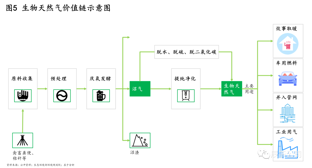 生物天然氣是指通過(guò)對(duì)秸稈、人畜糞便等生物質(zhì)經(jīng)過(guò)發(fā)酵形成沼氣后,進(jìn)一步提純獲得的天然氣,作為天然氣的替代品用于家庭炊事取暖、車用燃料、工業(yè)用氣等領(lǐng)域,它的價(jià)值鏈較長(zhǎng)(見(jiàn)圖5)。