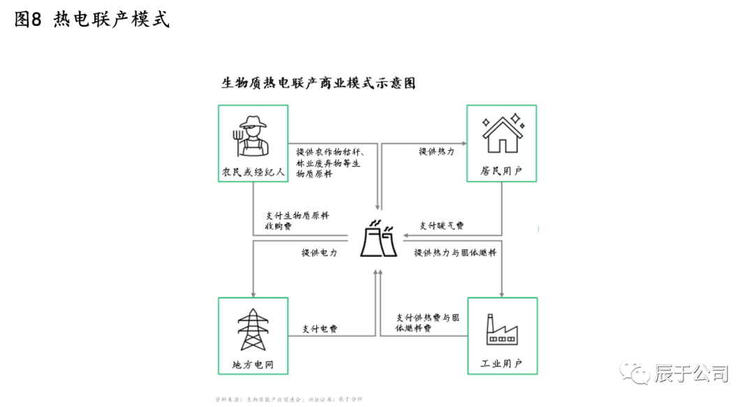 盈利壓力一方面將促進(jìn)行業(yè)洗牌,在優(yōu)勝劣汰的過(guò)程中預(yù)計(jì)行業(yè)集中度將逐步提升,民營(yíng)企業(yè)的份額會(huì)逐步降低;另一方面,行業(yè)也在積極探索新的商業(yè)模式,提升項(xiàng)目盈利性,其中熱電聯(lián)產(chǎn)是主要的方向(見(jiàn)圖8)。相比單純發(fā)電賣錢,熱電聯(lián)產(chǎn)在發(fā)電過(guò)程中產(chǎn)生的剩余熱量也通過(guò)向居民或工業(yè)用戶供熱的方式來(lái)獲取收入,能量利用率得到提升,經(jīng)濟(jì)效益和社會(huì)效益都更好。