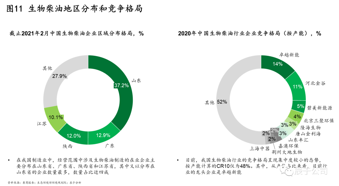 在銷售應(yīng)用上,國(guó)內(nèi)的主要渠道是出口、交通燃料、化工等,出口是拉動(dòng)行業(yè)發(fā)展的主要渠道,2019年出口占產(chǎn)量的比例達(dá)到80%。國(guó)內(nèi)需求的打開(kāi)是行業(yè)發(fā)展的最大希冀,其中最有望打開(kāi)的市場(chǎng)是交通燃料領(lǐng)域——生物柴油強(qiáng)制添加政策。部分城市已經(jīng)開(kāi)始在試點(diǎn),上海市2013年開(kāi)始在公交車上實(shí)行B5標(biāo)準(zhǔn)(添加比例5%)。現(xiàn)在國(guó)家已開(kāi)始全國(guó)范圍進(jìn)行B5 強(qiáng)制添加標(biāo)準(zhǔn)的意見(jiàn)征求,并有望隨著雙碳目標(biāo)深入推進(jìn)提升到B10。若政策落地實(shí)施,將產(chǎn)生450萬(wàn)噸~1000萬(wàn)噸的產(chǎn)能缺口。