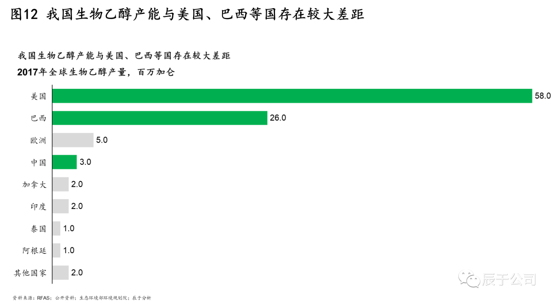 我國(guó)發(fā)展生物乙醇的總思路是“核準(zhǔn)生產(chǎn)、定向流通、封閉運(yùn)行、有序發(fā)展”,生物乙醇的生產(chǎn)、流通、銷售等都在嚴(yán)格限制范圍內(nèi)進(jìn)行,目標(biāo)到2025年達(dá)到688萬(wàn)噸產(chǎn)量(2020年400萬(wàn)噸)。但這一數(shù)字與美國(guó)、巴西等國(guó)家相比差距較遠(yuǎn),2017年全球生物乙醇產(chǎn)量中,中國(guó)的產(chǎn)量只有美國(guó)的二十分之一(見(jiàn)圖12)。