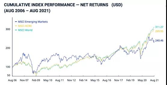 圖1 MSCI新興市場指數(shù)累積指數(shù)表現(xiàn)-凈回報(美元)(2006.8-2021.8)