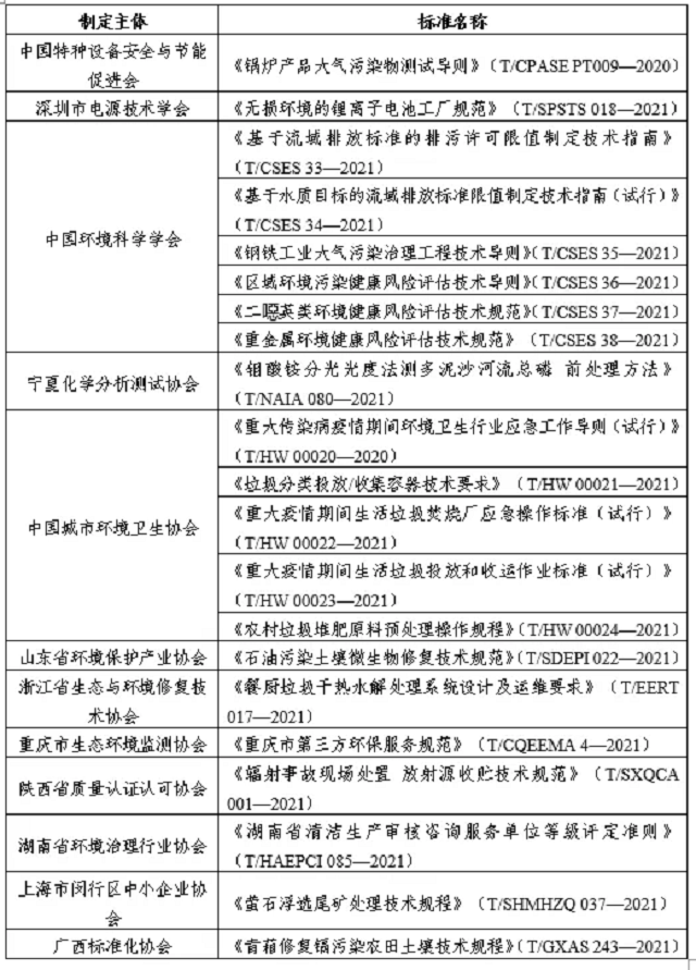 10月,全國(guó)團(tuán)體標(biāo)準(zhǔn)信息平臺(tái)公布了21項(xiàng)生態(tài)保護(hù)和環(huán)境治理類(lèi)團(tuán)體標(biāo)準(zhǔn),詳見(jiàn)下表。