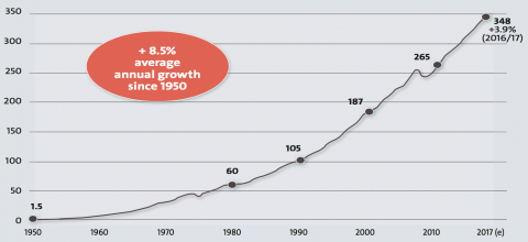 但是請環(huán)顧一下四周,有沒有發(fā)現(xiàn)你其實是被塑料包圍著。無論你在哪,塑料,這個人類創(chuàng)造的材料它一定在你身邊。自從上世紀(jì)五六十年代塑料被規(guī)?;a(chǎn)以來,它已經(jīng)取代了大部分其它材料,被用到了人類生活生產(chǎn)的各方各面。全球2018年生產(chǎn)的塑料總量按體積計算的話已經(jīng)超過了鋼的產(chǎn)量,達(dá)3.6億噸(塑料平均密度約1.1;鋼18.3億噸,密度7.8)。全球累計生產(chǎn)的塑料到2019年達(dá)到90億噸,相當(dāng)于1000座北京景山的重量。